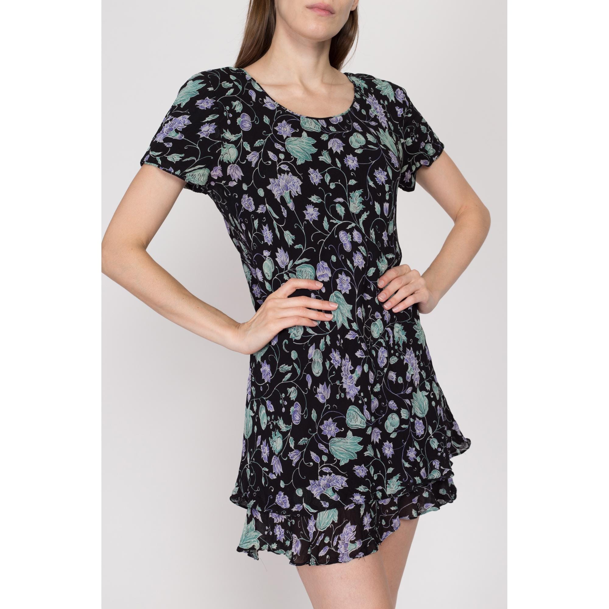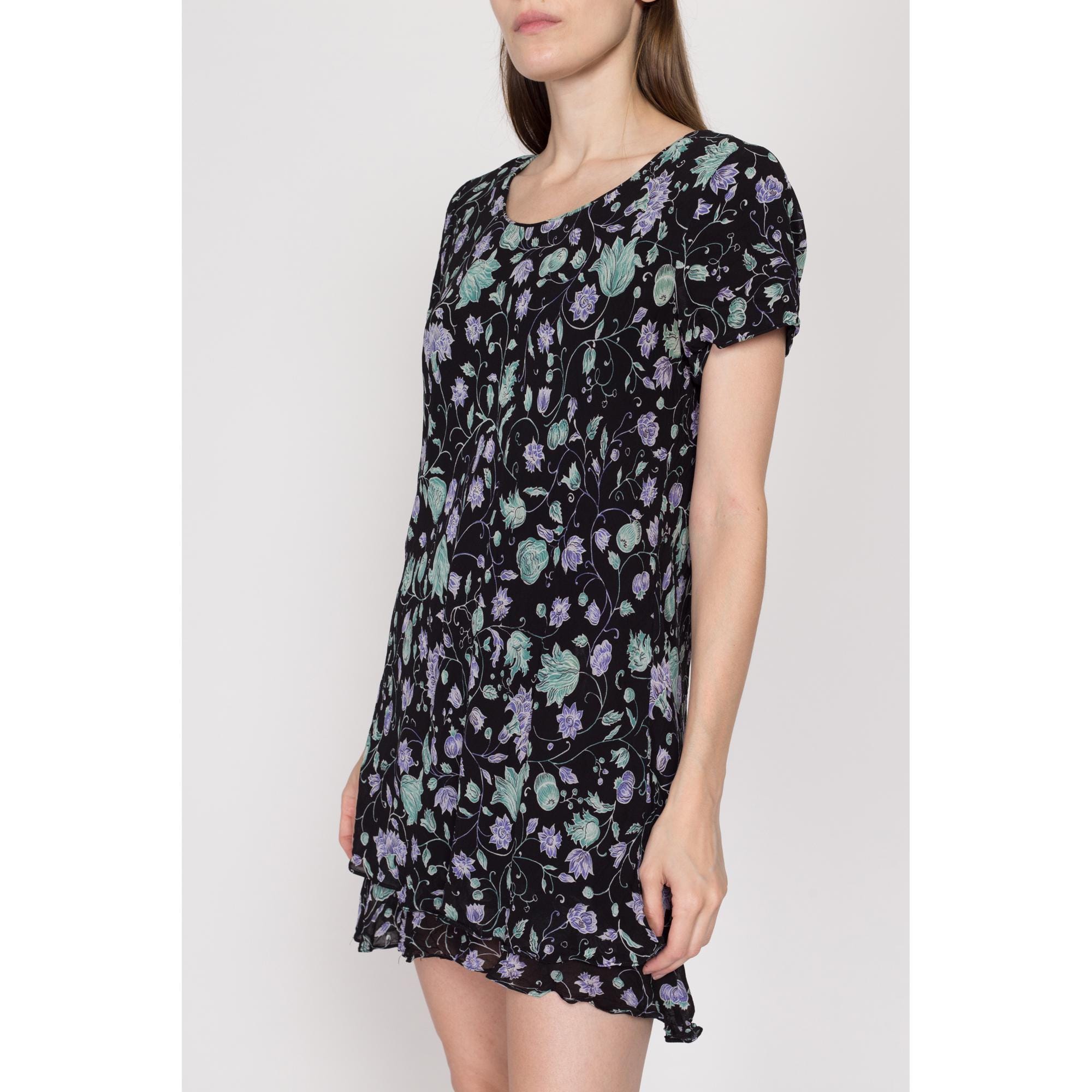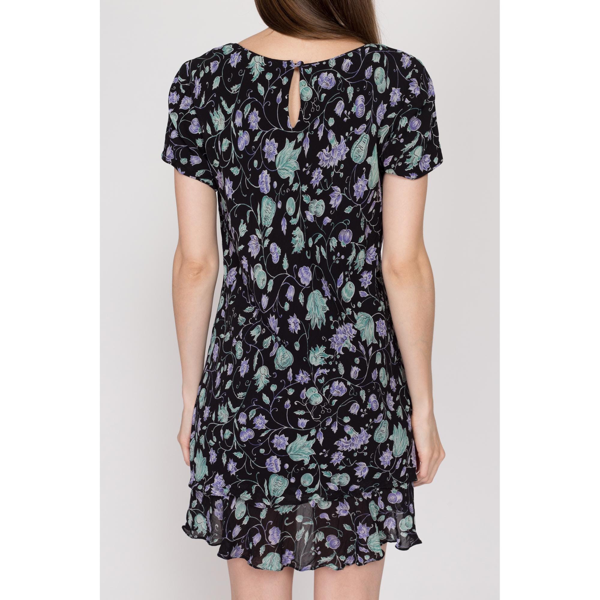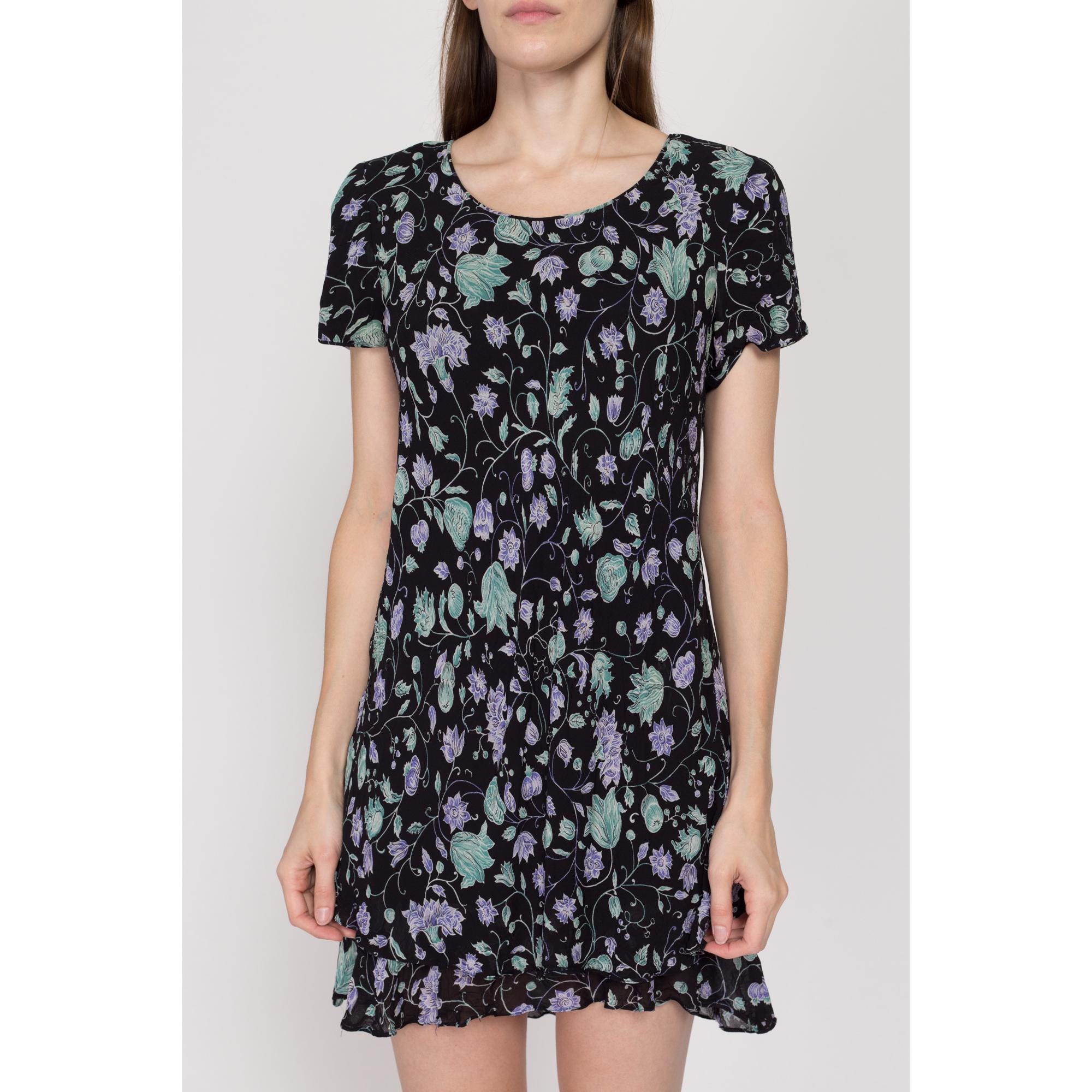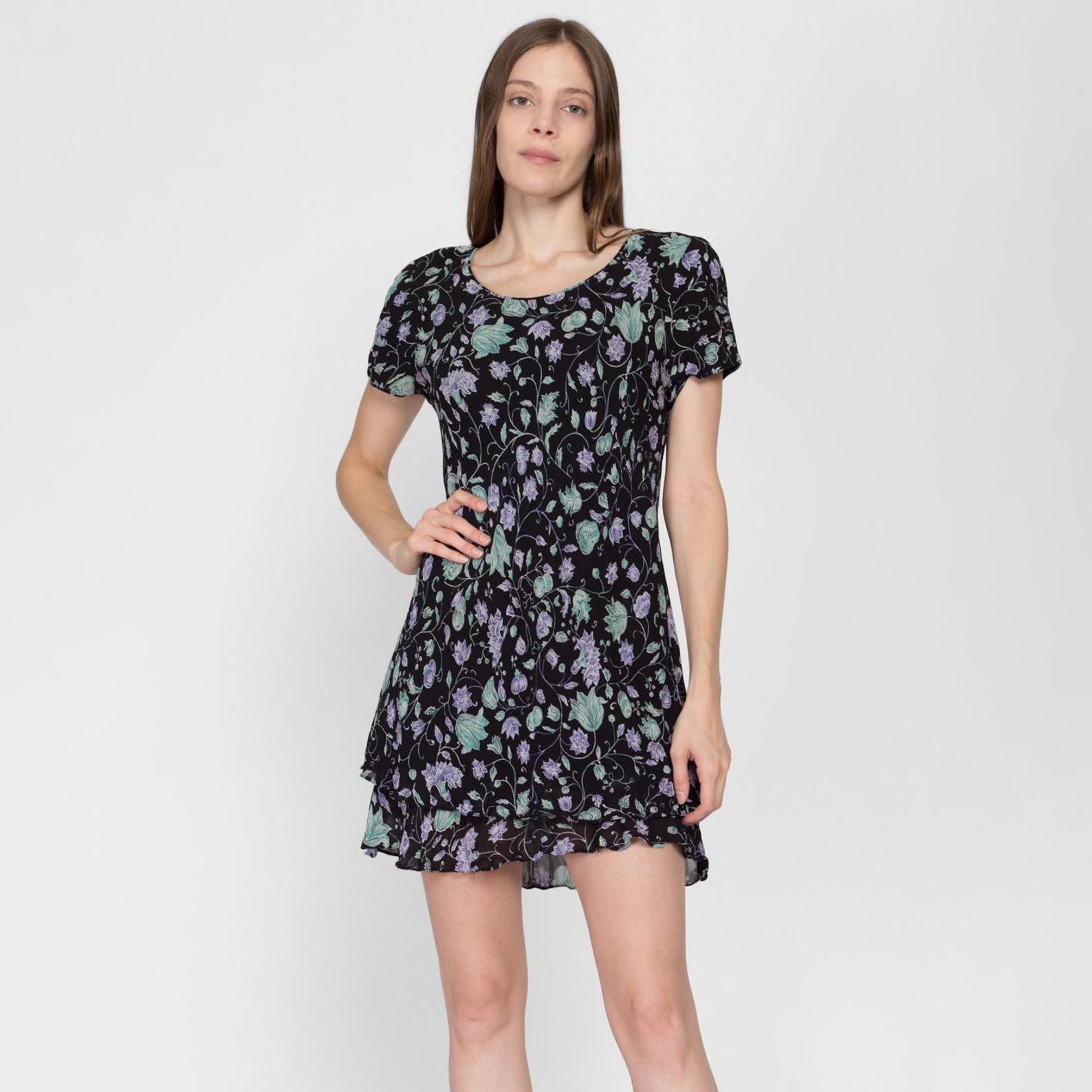 This dress is black in color, with fresh purple flowers and green leaves, which is romantic and full of vitality. The round neck design is simple and generous, the short sleeves are light and breathable, and the double-layer ruffled skirt adds a sense of agility and playfulness. It sways naturally when walking. The fabric is soft and skin-friendly, which is a good choice for summer wear that combines sweetness and comfort.